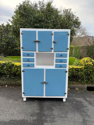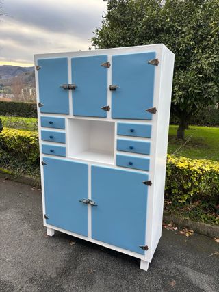 Mueble de cocina estilo alacena antigua, con un diseño vintage. - Puertas y cajones en color azul. - Estructura principal en color blanco. - Tiradores y bisagras metálicas.