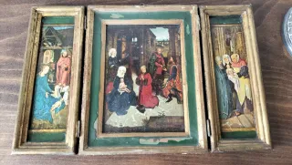 Tríptico religioso antiguo con escenas detalladas. - Marco dorado. - Bisagras visibles. Las fotografías son parte de la descripción del producto Fase,Antiguo,antigua,bargueño,buro,secreter,siglo,tallado,tallada,torneada,nogal,medieval,monedas,mueble,cobre,bronce,victoriano,época,isabelino,manuscrito,latín,romano,años,vintage,antigüedad,bonito,único,salón,decoración,armario,exclusivo,escritorio,entrada,comedor,entradita,recibidor,estilo,barroco,madera,ard deco,rural,herencia,rococó,plata,oro,cerámica,cuadro,lienzo,oleo,pintura,serigrafía