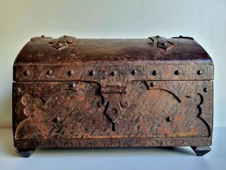 Auténtico cofre de época, datado en el siglo XVI. Una pieza con gran valor histórico y decorativo. - Fabricado en hierro forjado. - Diseño robusto y detallado. - Bisagras y cerradura metálicas. Medidas Largo 16. Alto 11. Fondo. 11 Interesados preguntar precio Más antigüedades en mi perfil Cambio antigüedades por coches o 4 x4