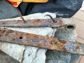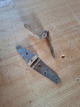 Conjunto de bisagras antiguas de hierro forjado. Piezas con un diseño clásico y robusto. - Material: Hierro forjado. - Estilo: Antiguo/Rústico. - Acabado: Desgastado por el tiempo.