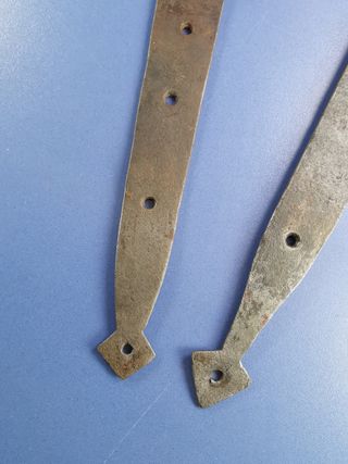 Conjunto de bisagras de hierro forjado con un diseño antiguo y rústico. - Piezas de hierro con pátina de óxido. - Diseños variados con remaches y agujeros para fijación. - Ideales para proyectos de restauración o decoración vintage.