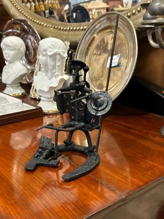 Figura artesanal de Don Quijote realizada en hierro forjado, y piezas antiguas: herradura, bisagra... Medidas 27 x 15 x 13 Guarda en Favorito nuestro perfil para no perderte nuestros descuentos y novedades diarias. Mucho más en nuestra tienda en Triana. Sevilla. Horario atención online en horario comercial.