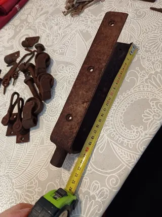2 cerrojos antiguos de hierro forjado y un pasador. Los precios son los siguientes: - Cerrojo de 20 cm de largo con forma circular en el tirador 9 € - Cerrojo de 16 cm de largo 7 € - Enganche del cerrojo 2 € El lote lo vendo por 15 €. Tengo más objetos antiguos de hierro forjado: bisagras, clavos, aldabillas, etc