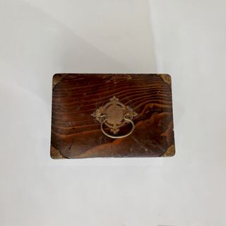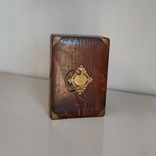 Caja antigua (aprox. 1880–1930) de origen europeo y estilo orientalista, realizada en madera maciza, con herrajes ornamentados. La caja es auténtica y todos los elementos son originales. Hecha a mano, acabado oscuro con veteado visible, herrajes metálicos dorados y cerradura antigua. La madera presenta algún signo de haber tenido polilla, pero ha sido decuadamente desinfectada, ligero desgaste en los herrajes y algo de oxidación en la cerradura y las bisagras. Le falta la llave y la parte de arriba de la cerradura. Medidas: 20 cm de largo, 7 cm de alto y 15 cm de ancho. #caja #cajaantigua #cajamadera #joyero #joyeromadera #ant