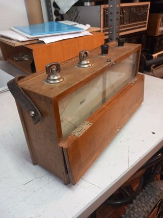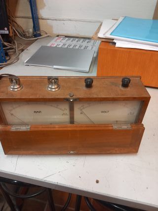 Instrumento de medición eléctrico de estilo vintage, alojado en una caja de madera. - Dos diales: uno para Amperios (Amp.) y otro para Voltios (Volt.). - Conexiones metálicas en la parte superior. - Tapa frontal abatible con bisagras.