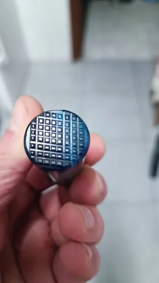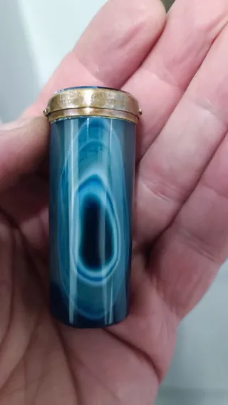 Precioso sello de escritorio o de bolsillo realizado en ágata natural bandeada de color azul profundo con espectaculares vetas concéntricas (efecto "ojo"). Una pieza de colección de finales del siglo XIX o principios del XX. Doble función: La base funciona como sello (talla en cuadrícula) y la parte superior cuenta con una tapa de latón con bisagra que revela un compartimento interior hueco (usado históricamente para pastillas, lacre en polvo o pequeñas cerillas). Material: Piedra dura (Ágata) y montura de latón/bronce.#Sello antiguo #Ágata azul#Objeto de escritorio#Siglo XIX#Pastillero antiguo#Lacre Alt. 6cm.x diam.2cm.
