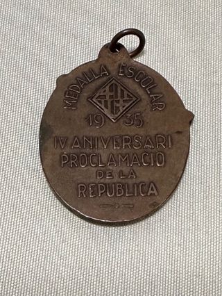 Medalla escolar conmemorativa del IV aniversario de la proclamación de la República. - Diseño ovalado con colgante. - Inscripción MEDALLA ESCOLAR 1935 IV ANIVERSARI PROCLAMACIO DE LA REPUBLICA.