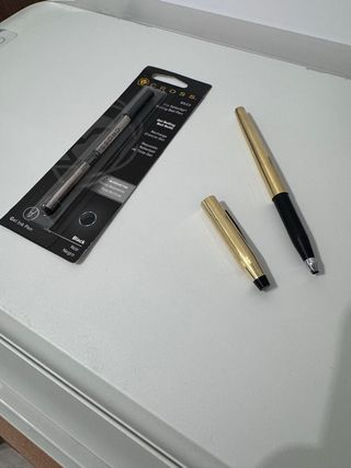 Bolígrafo recargable de la marca Cross chapado en oro de 23 quilates. - Acción giratoria para abrir y cerrar. - Accesorio elegante y atemporal. - Incluye cartucho de color azul, pero también está disponible en negro y rojo.