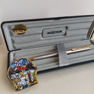 Elegante set de bolígrafos Inoxcrom. - Bolígrafo y pluma. - Detalles en oro electroplateado de 23.6 Kts. - Incluye caja original. - Incluye cartuchos de tinta negra. #boligrafo #pluma #tinta #nuevo #inoxcrom