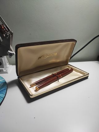 Bolígrafo (sin uso, pero funciona) y pluma estilográfica de la marca INOXCROM en perfecto estado, pluma con 0 uso, nunca utilizada. Vintage. Detalles de pluma, bolígrafo y estuche en acero inoxidable en color oro con el brillo impecable. Estuche en perfectas condiciones Antigüedad de mi abuelo, no se de qué años, quizá 1950 - 60 Made in Spain. Muy poco negociable Puedo hacer precio con el resto de artículos de mi perfil, gracias
