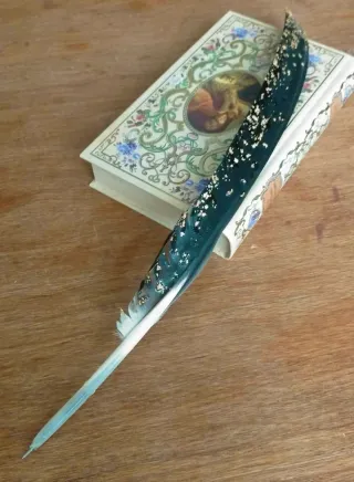 Bolígrafo con una pluma auténtica, decorada con detalles dorados. Realizado con una pluma real de cigüeña de 44cm de larga. Carga de bolígrafo color negro. Decorada con virutas de pan de oro.