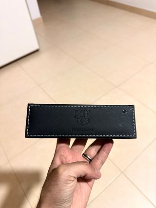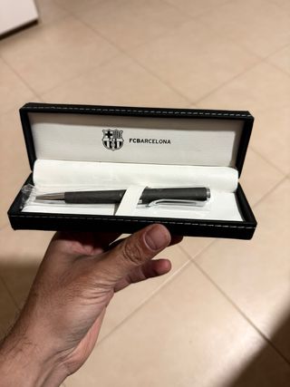 Bolígrafo del FC Barcelona, elegante y en perfecto estado. Se entrega en su estuche original. - Diseño moderno y sofisticado. - Color negro y detalles plateados. - Incluye estuche negro a juego.