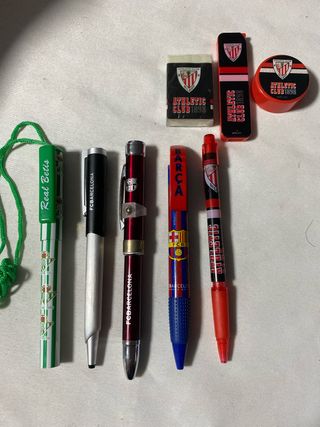Lote de bolígrafos de equipos de fútbol. A 2€/boligrafo. El del Athletic se vende todo junto en 4€. - Bolígrafo Real Betis. - Bolígrafos del FC Barcelona. - Portaminas Athletic Club. - Borrador Athletic Club. - Sacapuntas Athletic Club.
