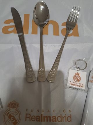 Conjunto de artículos del Club de Futbol Real Madrid. - Bolsa de tela blanca con logo. - Juego de cubiertos (cuchillo, tenedor, cuchara). - Llavero con escudo. - Dos bolígrafos (uno azul y uno blanco).