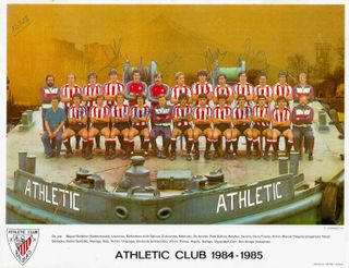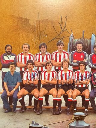 - Lámina foto del Athletic Club Bilbao de la temporada 1984-1985, con las firmas originales en bolígrafo de once jugadores y su entrenador: Goikoetxea, Julio Salinas, Meléndez, Patxi Salinas, Sarabia, De la Fuente, Noriega, Nuñez, Urquiaga, Urtubi, Gallego y Clemente entrenador. - Foto cartulina en la gabarra en el año que ganaron la Copa de Rey y la Supercopa. Comprada en el estadio San Mamés. - Equipo que ganó la Liga de 1983. - Firmas originales hechas por ellos para mí el 12/03/1985 en bolígrafo sobre la foto, en el vuelo que les llevaba a Madrid a jugar la ida de la Copa con el Real Madrid al día siguiente.