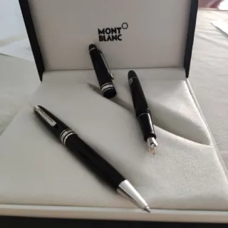 Elegante juego de escritura Montblanc. - Bolígrafo LeGrand y portaminas modelo Meisterstuck - Acabado en negro brillante. - Detalles en dorado. Precios en página oficial Montblanc Bolígrafo (490€), Portaminas (450€) Se trata de un artículo personal que nunca se ha usado, por lo que puedo garantizar su origen y perfecto estado de conservación Se puede enviar previo pago (Transferencia bancaria o Bizum)