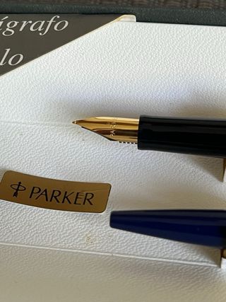 Elegante set de escritura Parker, totalmente nuevo y sin estrenar, presentado en su estuche original. Fabricados en Reino Unido, lo que aporta un extra de valor y autenticidad para coleccionistas y amantes de la escritura de calidad. ✨ Detalles: • Estilográfica con plumín en acabado dorado. • Bolígrafo Parker a juego, de trazo suave y preciso. • Cuerpo azul con detalles dorados. • Grabado “Made in UK” en ambas piezas. • Incluye caja original Parker, ideal también para regalo. Un conjunto distinguido y duradero, perfecto tanto para uso personal como para sorprender con un regalo elegante.