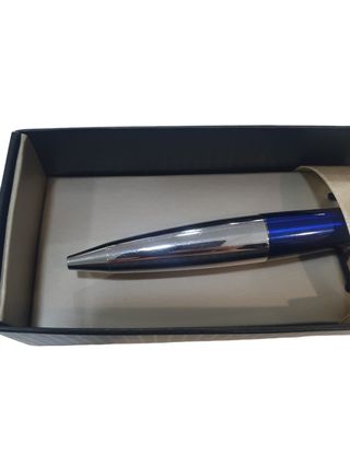 Elegante bolígrafo de la marca Parker, con un diseño moderno y sofisticado. - Cuerpo principal en color negro mate. - Detalles en azul brillante y plateado. - Incluye estuche original.