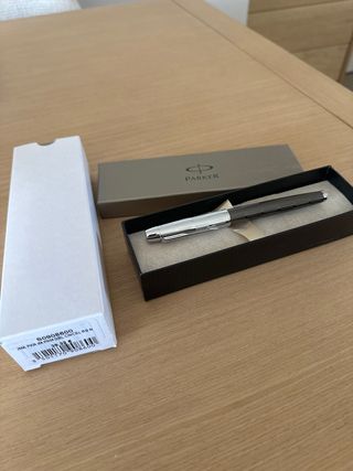 Elegante bolígrafo Parker. - Cuerpo metálico con detalles rayados. - Clip plateado característico de la marca Parker. - Presentado en su caja original.