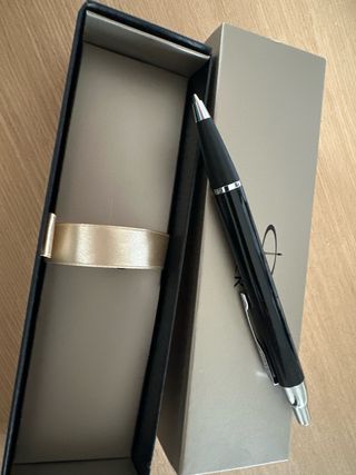 Elegante bolígrafo de la marca Parker en color negro. Presentado en su caja original, es un accesorio sofisticado. - Diseño clásico y atemporal. - Acabados metálicos plateados.