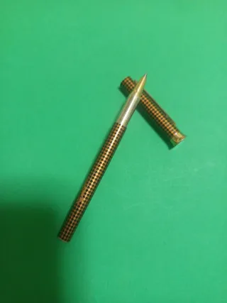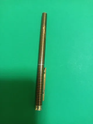 Bolígrafo vintage de la marca Pierre Cardin, un accesorio de escritura con estilo de los años 80. - Diseño con patrón de rombos en dorado y negro. - Clip metálico dorado.