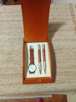 Elegante estuche de madera con un reloj bolígrafo y portaminas Bellbol hay que reponer la carga y la pila del reloj aunque de este último no garantizo el funcionamiento de ahí el precio - Reloj con correa de piel marrón. - Dos bolígrafos con detalles plateados y cuerpo de madera.