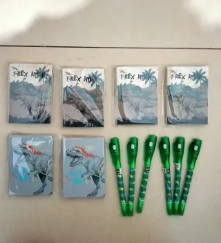 Conjunto de libretas y bolígrafos con diseño de dinosaurios. - 6 libretas con temática T-Rex. - 6 bolígrafos de tinta verde con detalles de dinosaurios. Los joligrafis tiene luz ultravioleta