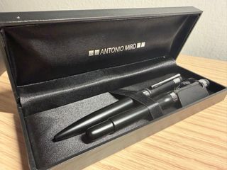 Elegante estuche de la marca Antonio Miro que contiene dos bolígrafos. - Diseño moderno y sofisticado. - Acabado en negro mate. - Incluye dos instrumentos de escritura.