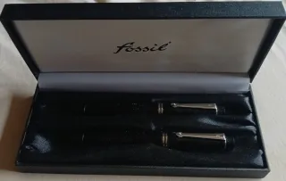 Bolígrafo y pluma estilográfica. FOSSIL. Bolígrafo y pluma estilográfica, en color negro y con detalles metálicos plateados en el clip y la boquilla. Vienen en una elegante caja negra acolchada y forrada con tela satinada gris en el interior para protegerlos. Sin estrenar.