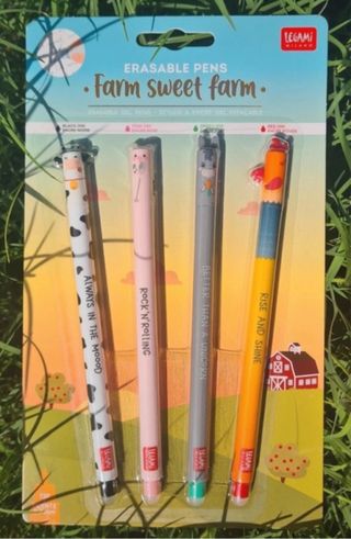 Conjunto de 4 bolígrafos borrables de la colección Farm Sweet Farm de Legami. - Diseño de animales de granja. - Tinta negra, rosa, verde y roja. - Mensajes inspiradores en cada bolígrafo.
