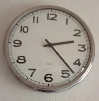 Reloj de pared redondo con marco plateado. - Diseño moderno y minimalista. - Esfera blanca con números negros. - Ideal para cocina o cualquier estancia.