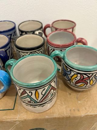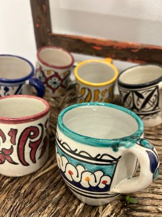 Conjunto de tazas de cerámica con diseños únicos pintados a mano. Cada pieza es especial y añade un toque artístico a tu mesa. - Diseños variados y coloridos. - Acabado artesanal. - Ideales para café o té.