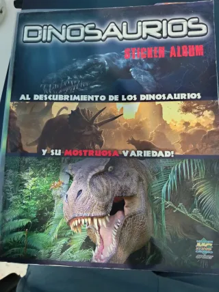Álbum de dinosaurios con la mayoría de las pegatinas incluidas. Ideal para coleccionistas. Las que faltan se pueden conseguir en páginas de coleccionistas como TC - Título: Dinosaurios: Al descubrimiento de los dinosaurios y su monstruosa variedad. - Incluye pegatinas de diferentes especies de dinosaurios. - Cubierta con imágenes de dinosaurios marinos, triceratops y tiranosaurio rex.