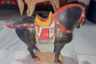 Figura decorativa de un caballo de estilo chino, con detalles pintados a mano. - Elaborado en porcelana. - Colores negro, rojo, amarillo y azul. - Inscripciones doradas en el cuerpo.