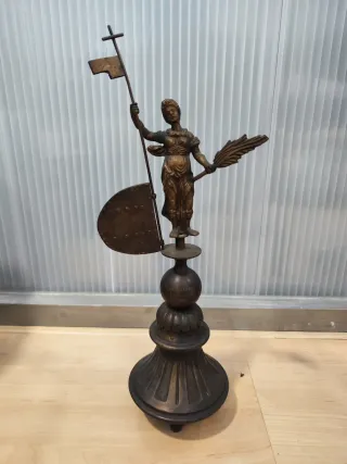 Figura decorativa tipo veleta, conocida como el Giraldillo, elaborada en metal. - Representación de una figura femenina con una bandera y una palma. - Base ornamental con detalles. - Material: Metal. Caja 8