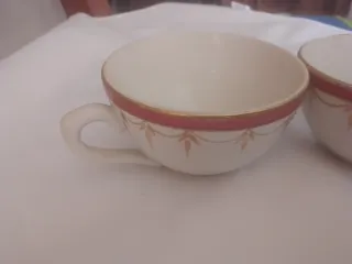 Set de dos tazas de la reconocida marca La Cartuja de Pickman de Sevilla. Piezas clásicas con un diseño elegante. Rareza pintadas a mano alzada y no con plantilla que es lo habitual en la marca - Color blanco con detalles en rojo y dorado. - Borde decorado con motivos vegetales.