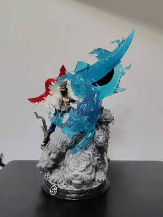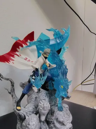 Estatua detallada del personaje Kakashi de Naruto. Mide aproximadamente 22 cm - Figura de colección. - Base con diseño de rocas y figuras. - Efectos de agua translúcidos en azul.
