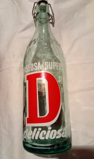 Botella de cristal antigua con cierre de ballesta. - Marca: Super Deliciosa - Color: Verde - Diseño: Con relieve decorativo en el cuello y gran D roja en el frontal.