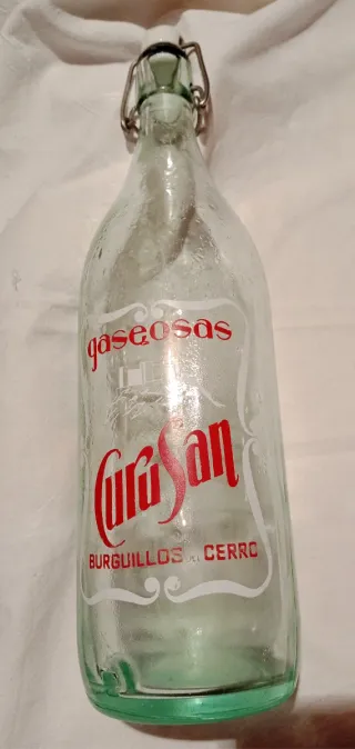Botella de cristal antigua con cierre de ballesta. Presenta el logo de gaseosas Curusan y Burguillos del Cerro. - Material: Cristal. - Cierre: Ballesta metálica con tapón de cerámica.
