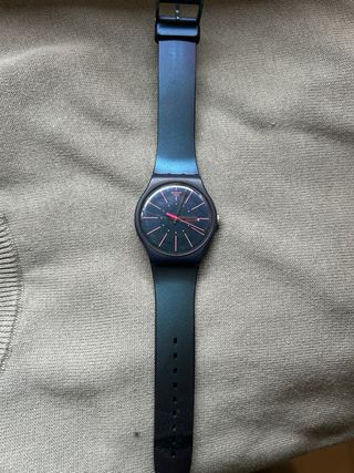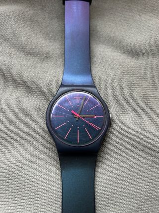 Reloj Swatch con un diseño moderno y llamativo. La correa presenta un degradado de color que va del morado al azul oscuro, creando un efecto visual único. - Esfera oscura con detalles en rosa. - Correa con acabado degradado.