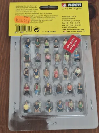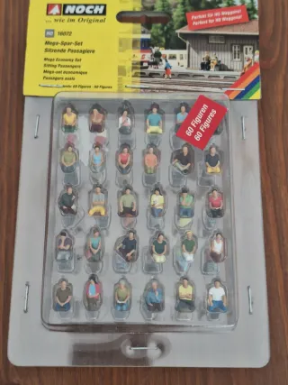 Set de 60 figuras de pasajeros sentados de la marca Noch, escala H0. Ideales para maquetas y dioramas. Modelismo ferroviario. Alta calidad, nada que ver con las que se venden de la misma marca sin pintar, ni con las chinas. Voy a vender todo mi material por abandono de la afición, iré sacando el material paulatinamente. No leer: modelismo ferroviario, renfe fleishmann, Ibertren, Marklin, mabar, vías, cruces, Piko, Kato, Electrotren, escala h0, escala n, locomotora, tren, digital, Faller, Vollmer, Noch, Walthers, modelismo, wargame, mig, vallejo, citadel, tamiya, revell, Perry, warlord, warhammer