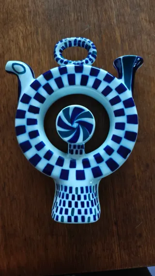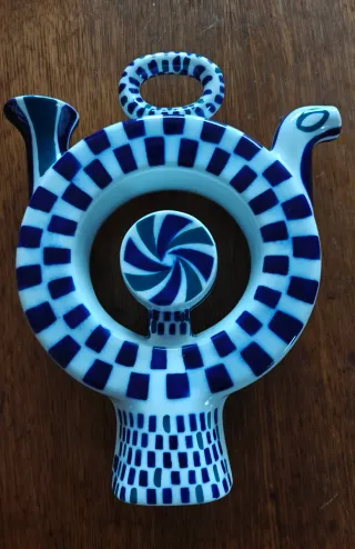 Pieza de cerámica de Sargadelos, modelo número 1. Presenta un diseño circular con un asa superior y un pico en la parte superior derecha. El cuerpo está decorado con un patrón de cuadros azules y blancos. - Diseño circular. - Asa superior. - Decoración a cuadros.