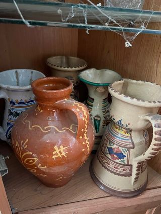 Conjunto de botijos y jarras de cerámica con diseños tradicionales. - Cerámica artesanal. - Motivos decorativos pintados a mano. - Piezas únicas con encanto rústico.