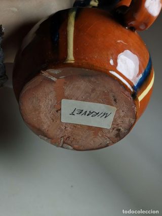 Botijo de colección de la localidad de Miravet, Tarragona. Pieza de cerámica con un diseño único.Procedente de extensa coleccion exclusiva de botijos desde los años 50 a los 90 todos ellos de la peninsula iberica y de localidad procedencia identificada en la mayoria de los casos Anchura maxima aproximada 25 cm Altura maxima aproximada 30 cm - Estilo tradicional. - Acabado esmaltado.