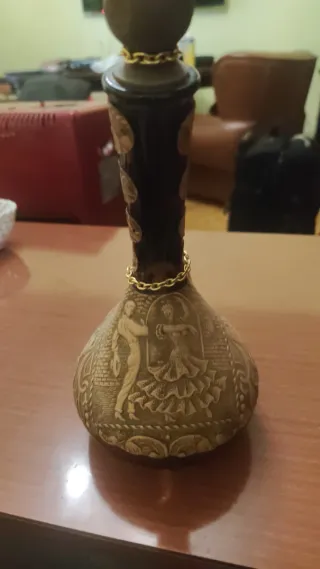 Botijo de cerámica con un diseño muy detallado y llamativo. - Representación de figuras bailando flamenco. - Cadena dorada decorativa en el cuello. - Acabado en tonos tierra.