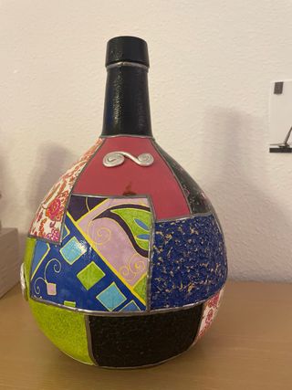 Botijo artesanal con un diseño único de patchwork. - Decorado con tela de diferentes estampados. - Colores vibrantes y variados. - Acabado con detalles plateados.