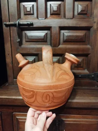 Botijo tradicional de barro, elaborado artesanalmente. - Diseño circular con asas. - Decoración con motivos ondulados. - Acabado en terracota.