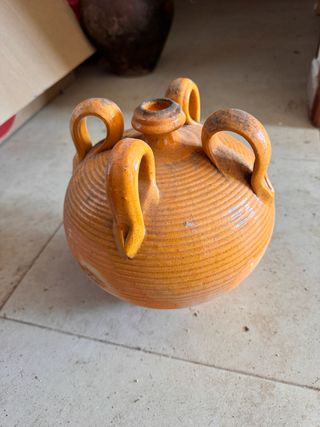 Botijos antiguos de cerámica con un acabado naranja. Su diseño presenta un cuerpo redondeado con múltiples asas y un acabado acanalado. 2 UNIDADES =40€ 1 UNIDAD= 25€ - Material: Cerámica. - Color: Naranja. - Diseño: Cuerpo redondeado con asas y acanalado.