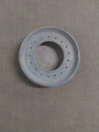 Cuenco de cerámica o arcilla sin esmaltar, con un diseño rústico y natural. Servía antiguamente para colocar encima los botijos cerámicos o de arcilla sin esmaltar. Medidas : Diámetro superior ext. 20 cms. Diámetro superior int. 9,5 cms. Diámetro base 17 cms. Altura 5 cms. Tiene un pequeño descantillado con falta de material( foto 2). - Material: Cerámica o arcilla. - Acabado: Sin esmaltar. - Diseño: Con múltiples perforaciones alrededor del borde.