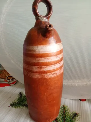 Botijo de barro tradicional con un diseño rústico y funcional. Ideal para coleccionistas o para uso decorativo. La ansa asido rota pero muy bien pegada tal y como se ve en la foto madidas alto 30Cm Precio 10€ - Color marrón arcilla. - Presenta bandas decorativas en blanco. - Asa superior para facilitar su manejo. Ago envíos por wallapop.
